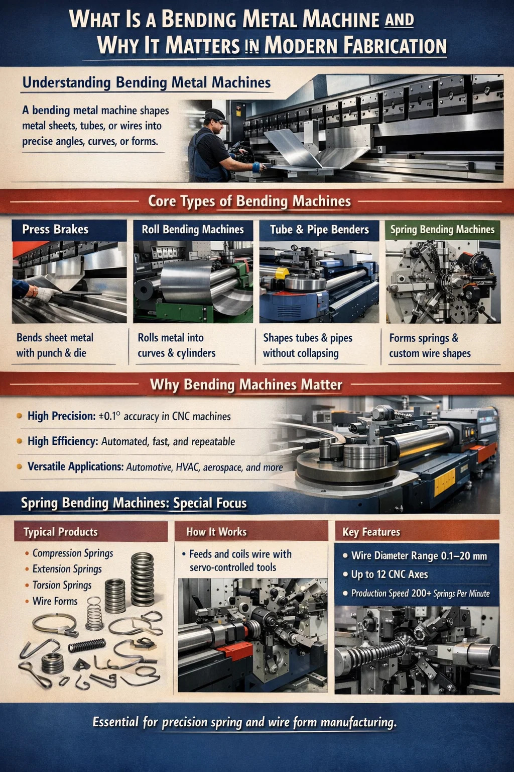 La cintreuse à ressorts est un sous-ensemble spécialisé de la famille plus large des cintreuses. Unlors qu'une presse plieuse générale se concentre sur la tôle, une machine à cintrer les ressorts est conçu spécifiquement pour enrouler, enrouler et former des fils ou des tiges en ressorts de compression, ressorts d'extension, ressorts de torsion et formes de fil personnalisées. Ces deux types de machines coexistent souvent dans la même installation – et comprendre comment ils se complètent est essentiel pour tout responsable de fabrication qui recherche des équipements.