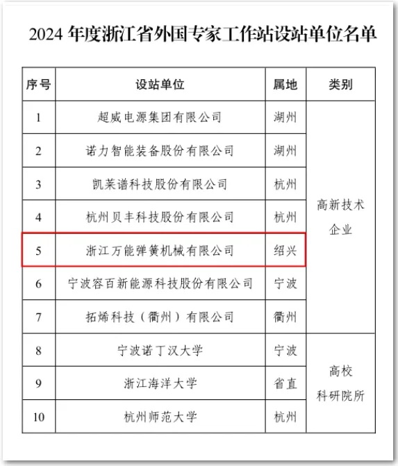 2024, Zhejiang Universal Spring Machinery Co., Ltd est honorée d'être la seule entreprise sélectionnée dans la ville de Shaoxing, une fois de plus pour que la ville de Shaoxing remporte cet honneur. Cette réussite confirme non seulement la stratégie d'innovation technologique et de développement international de l'entreprise, mais marque également une nouvelle étape dans la compétitivité mondiale.