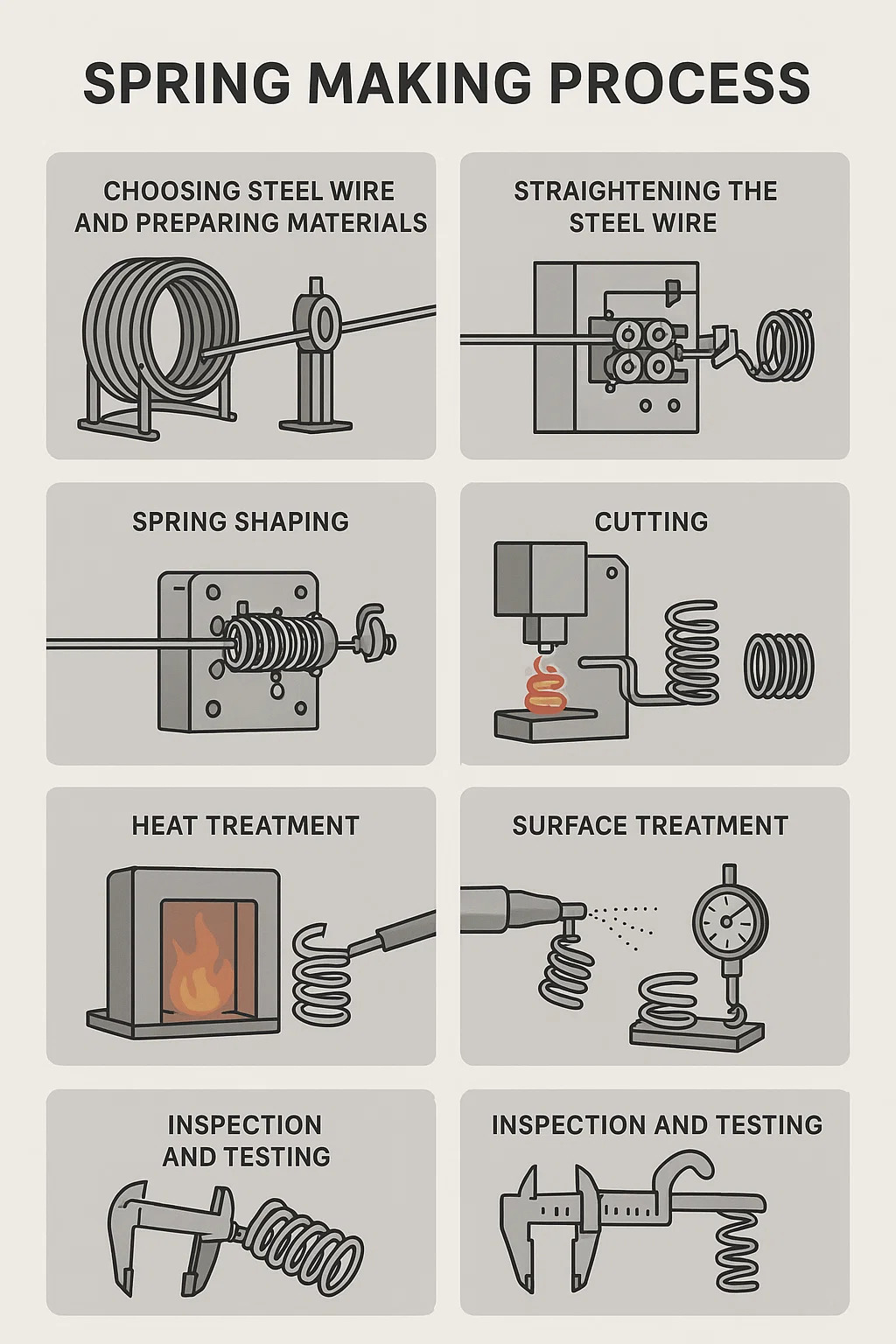 • Chauffage : Le ressort est placé dans un four et chauffé à une température spécifique élevée (apparaissant légèrement rougeâtre).