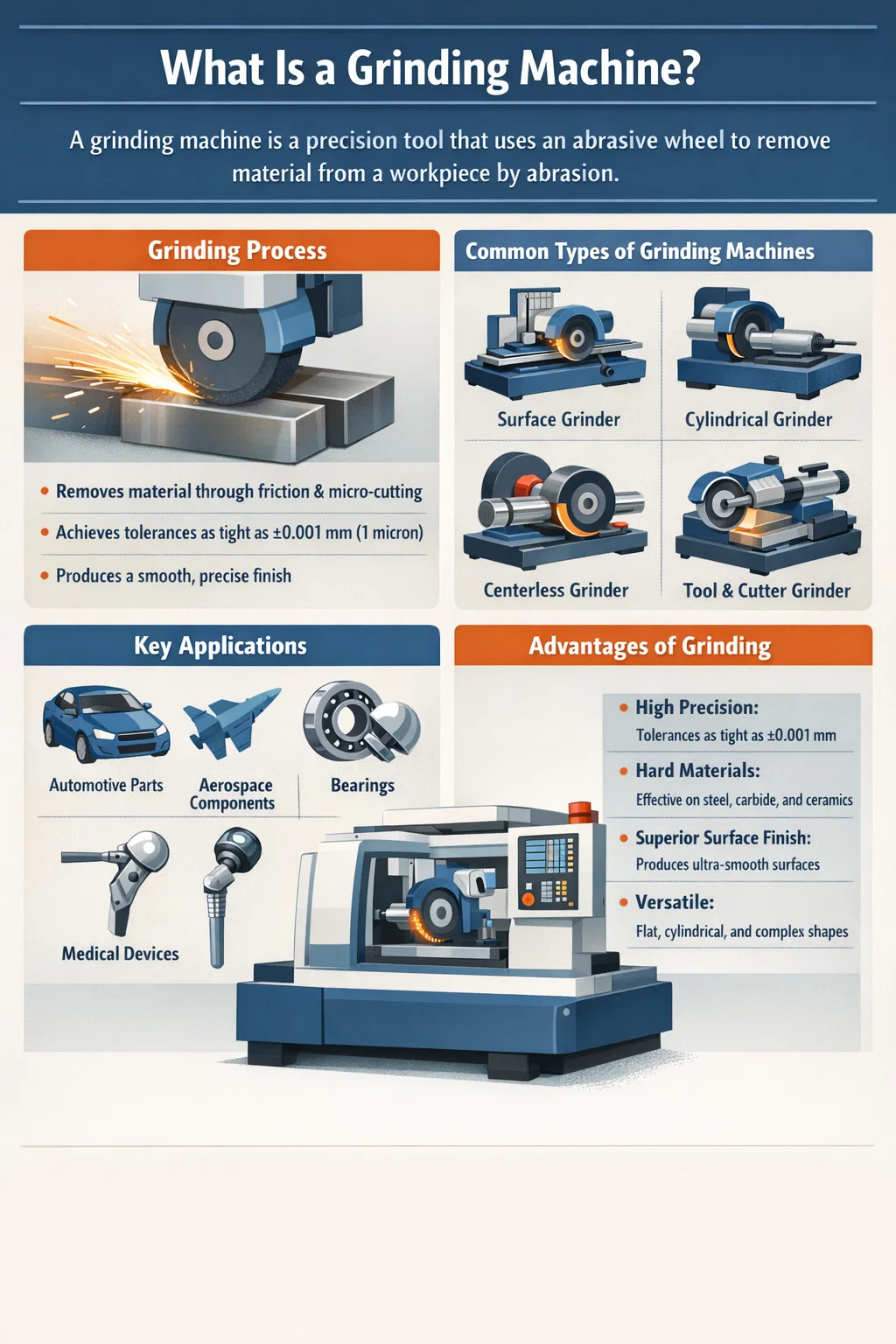 Le principe de fonctionnement d'une rectifieuse est basé sur usinage abrasif — l'enlèvement mécanique de matière par friction et micro-coupe par des particules abrasives. Comprendre le fonctionnement détaillé de ce processus aide les opérateurs à optimiser les performances de meulage et à obtenir des résultats cohérents.