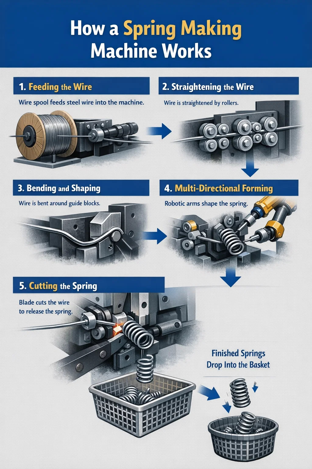 Les machines modernes de fabrication de ressorts disposent généralement de plusieurs bras robotiques mobiles. Si des ressorts avec des crochets ou des formes inhabituelles sont nécessaires, ces bras robotiques s'étendent dans différentes directions (haut, bas, gauche et droite) pour plier le fil dans la forme prédéterminée, un peu comme si on plie un fil à la main.