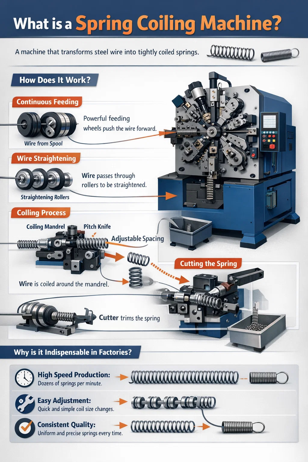 En termes simples, une machine à enrouler les ressorts est une machine spécialement conçue pour « enrouler » un fil métallique en forme de spirale.