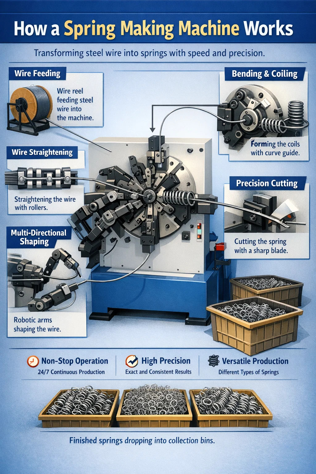 La machine a généralement une bobine de fil à l’arrière, contenant une grande bobine de fil d’acier. Les rouleaux d'alimentation internes agrippent fermement le fil, l'alimentant de manière constante et précise dans le noyau de la machine. La quantité de fil alimenté détermine la longueur du ressort.
