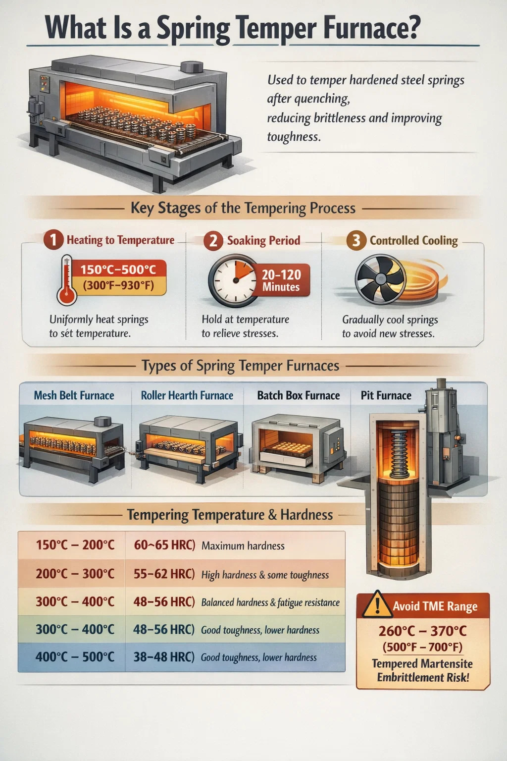 Une zone critique à éviter est la gamme de fragilisation par martensite trempée (TME) , généralement entre 260°C et 370°C (500°F à 700°F) . Le revenu dans cette plage peut en fait réduire la ténacité plutôt que de l'améliorer, un phénomène provoqué par la précipitation de carbures aux limites des grains d'austénite antérieurs. Les opérateurs responsables de fours de trempe à ressort conçoivent leurs cycles de trempe pour rester en dessous ou au-delà de cette plage plutôt que de s'y attarder. C'est l'une des raisons pour lesquelles les spécifications des ressorts de soupapes automobiles spécifient fréquemment un revenu compris entre 380°C et 420°C ou plus.